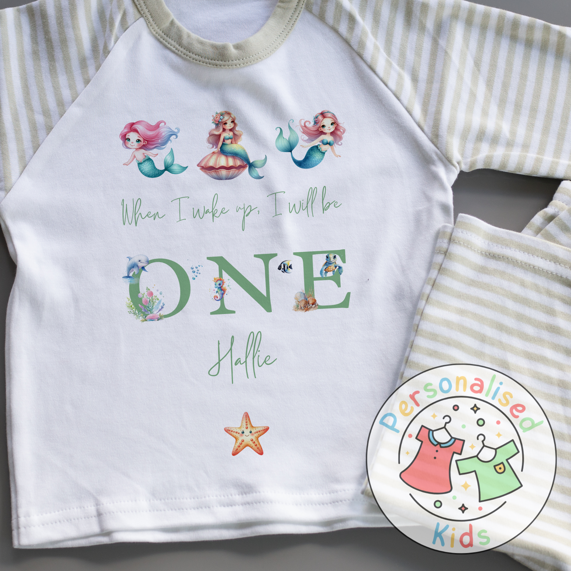 Personalised Mermaid Birthday Pyjamas – “When I Wake Up, I Will Be” Design GREEN WORD