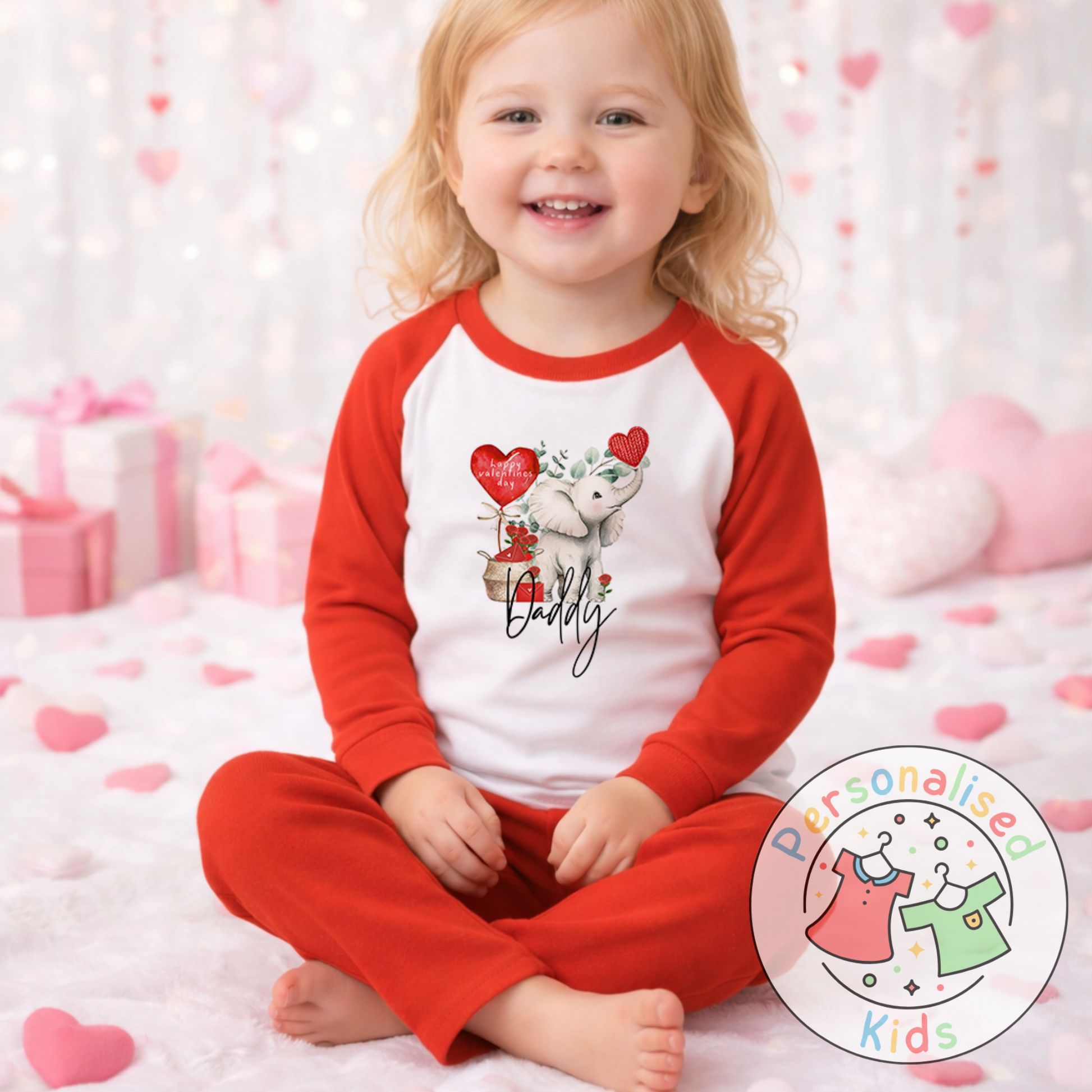 Celebrate Valentine’s Day in the sweetest way with this adorable personalised pyjamas featuring a charming Valentine-themed elephant design and your chosen name. Perfect for baby’s first Valentine’s Day, toddler Valentine outfits, and creating special keepsake photos.