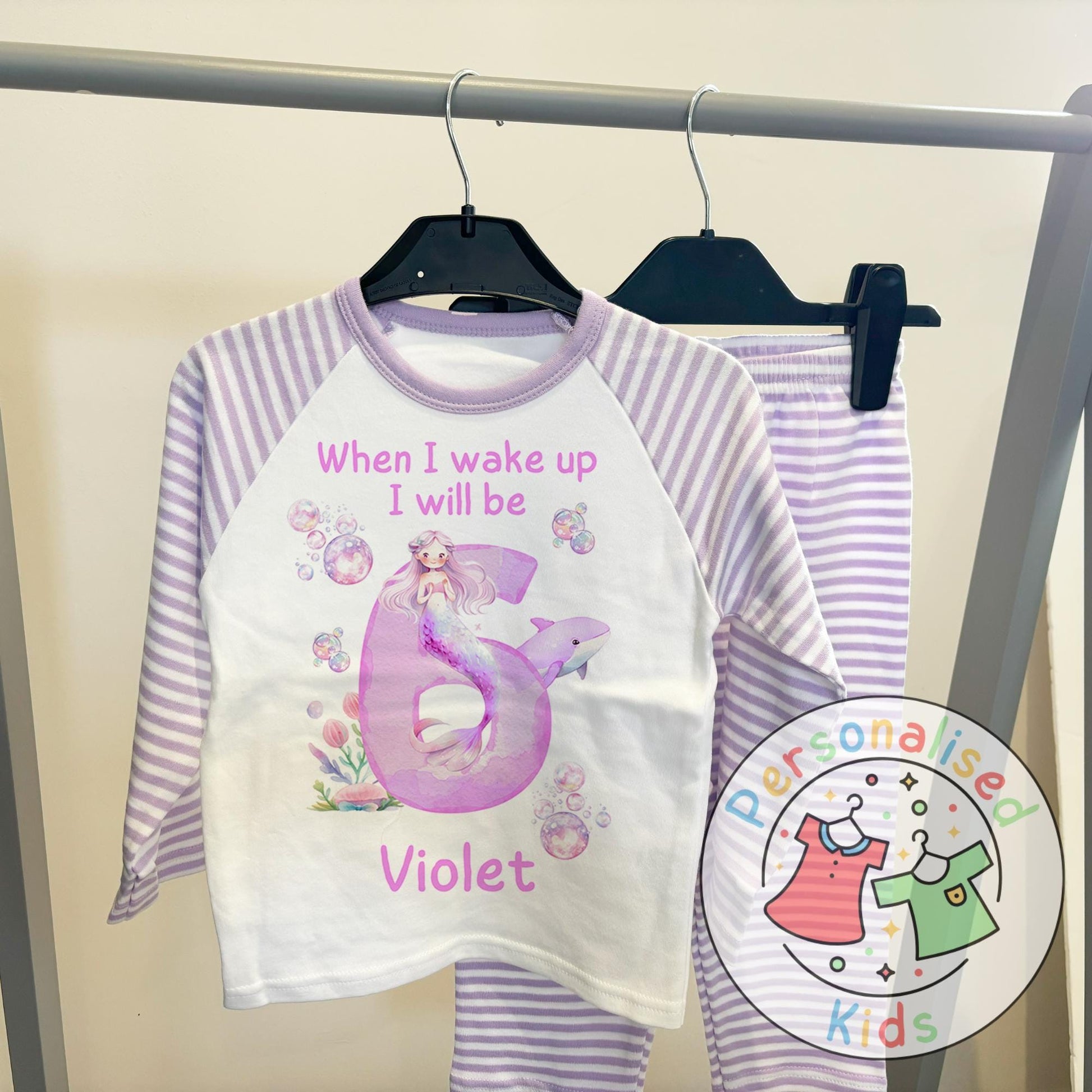 Make a splash on their special day with our enchanting mermaid birthday pyjamas! Featuring a beautiful purple design with whimsical under-the-sea details, these pyjamas are personalized with your childβs name and age, making them the perfect birthday morning outfit.