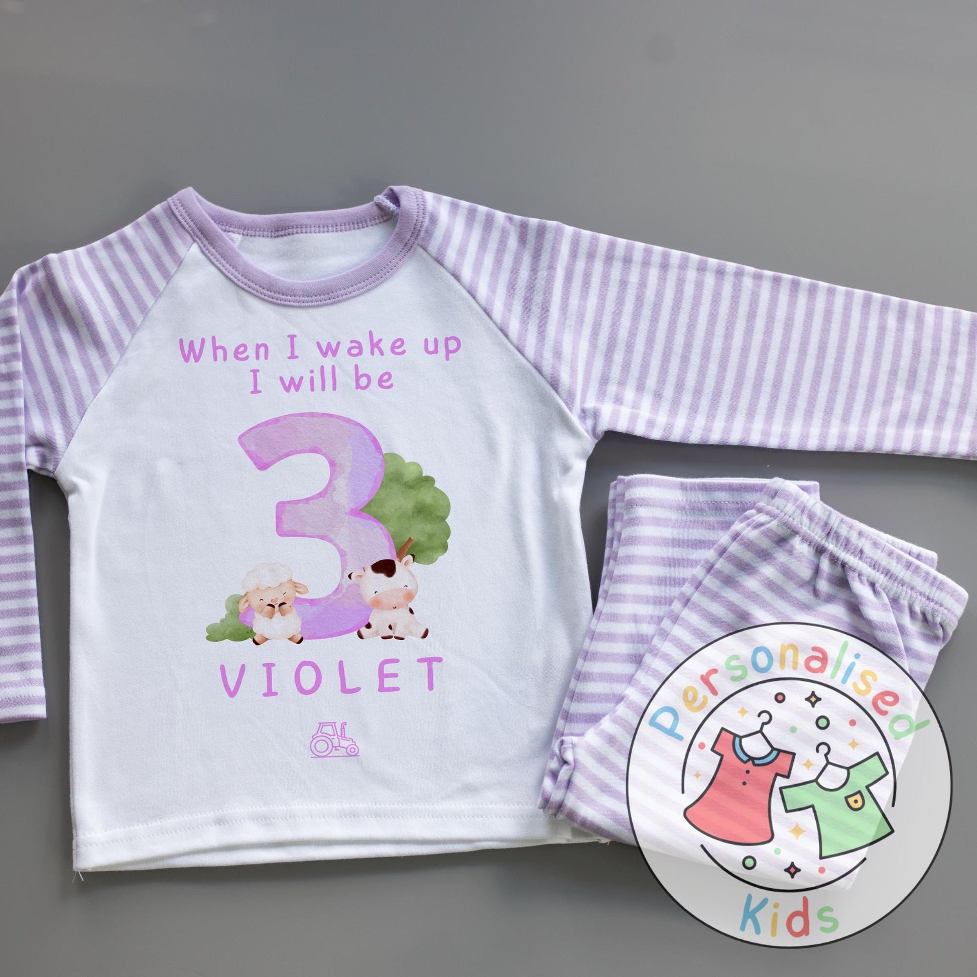 Celebrate your little one's special day with our adorable farm animal birthday pyjamas! Featuring a sweet purple design full of cute farmyard friends, these pyjamas are personalized with your child’s name and age, making birthday mornings even more magical.