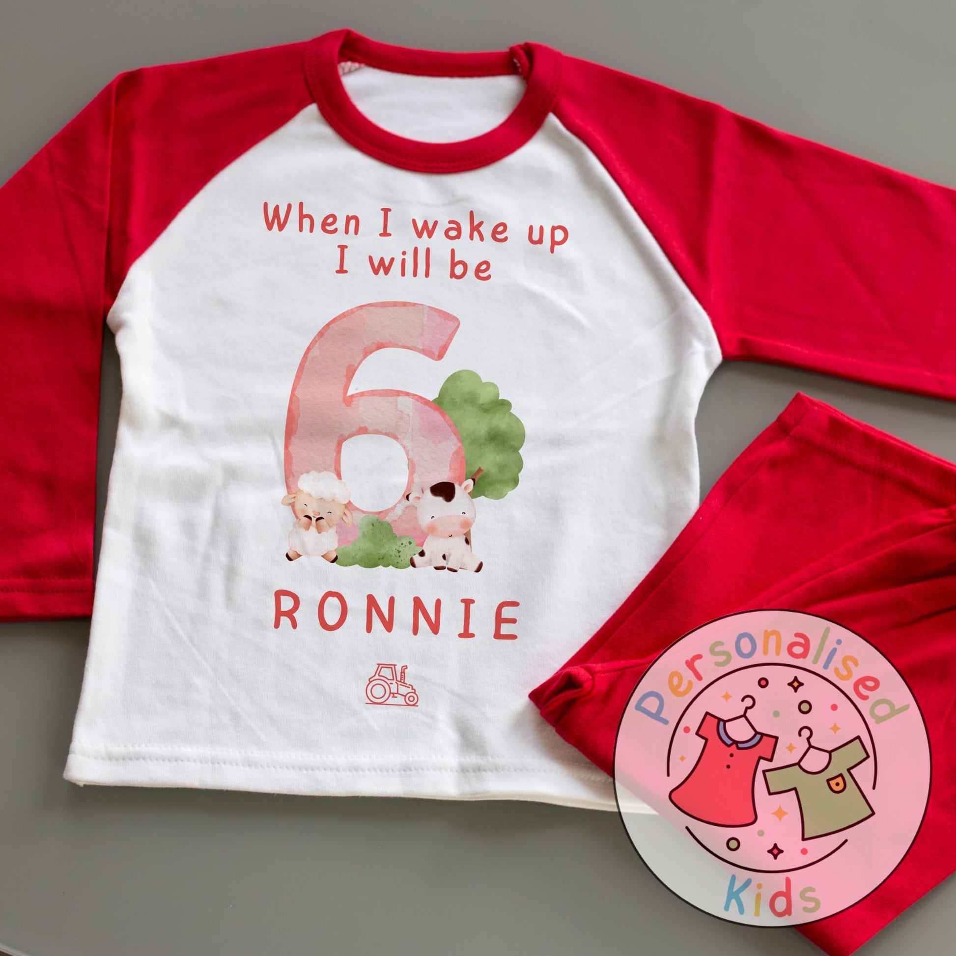 Celebrate your little one's special day with our adorable farm animal birthday pyjamas! Featuring a sweet red design full of cute farmyard friends, these pyjamas are personalized with your child’s name and age, making birthday mornings even more magical.