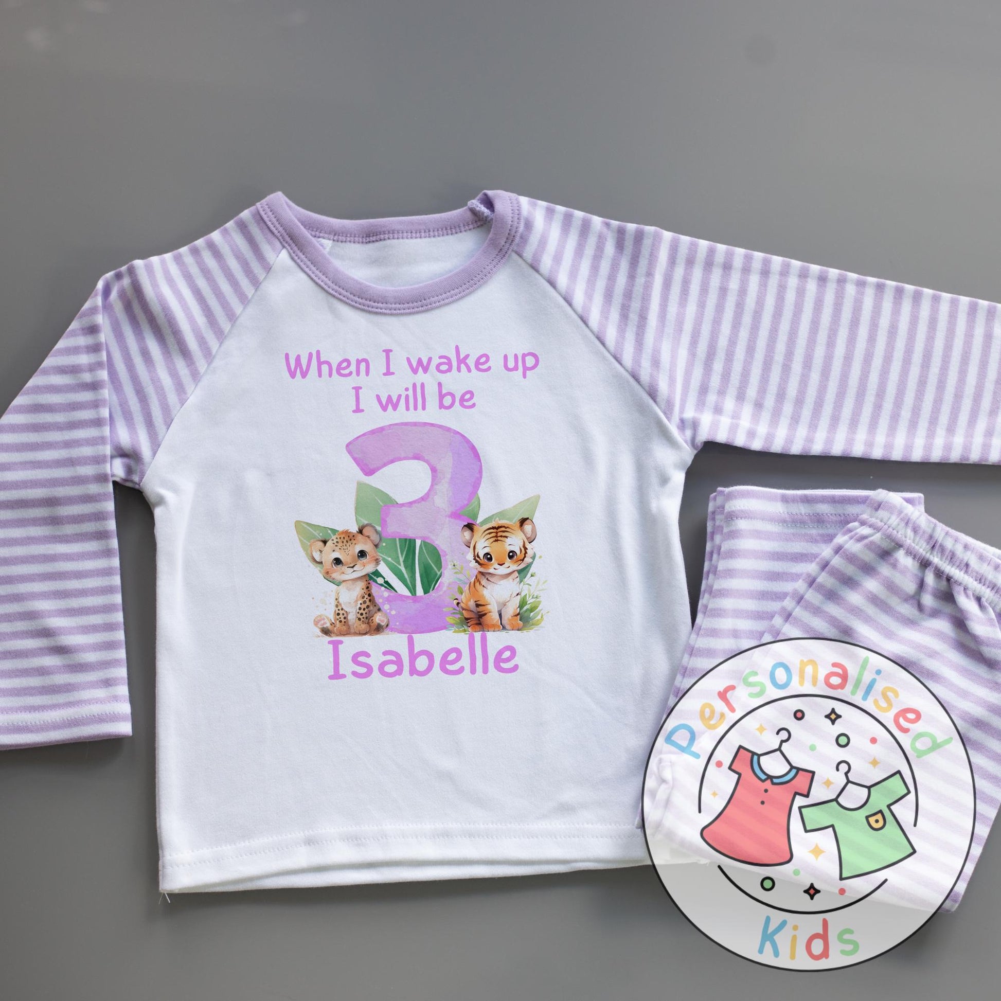 Make your child's birthday morning extra special with our adorable safari animal birthday pyjamas! Featuring a charming purple design with cute safari animals, these pyjamas are personalized with your child’s name and age, making them a perfect keepsake for their big day.
